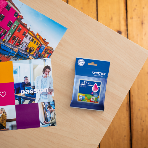 Originálna purpurová atramentová kazeta Brother LC552M v samostatnom balení je určená na kvalitnú farebnú tlač s vernými odtieňmi. Ponúka výťažnosť až 550 strán podľa normy ISO/IEC 24711.
