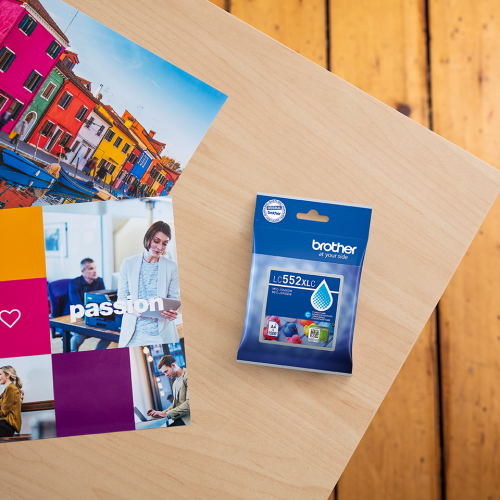 Originálna azúrová atramentová kazeta Brother LC552XLC s vysokou výťažnosťou je vhodná na častú farebnú tlač doma aj v kancelárii. Ponúka výťažnosť až 1 500 strán podľa normy ISO/IEC 24711.