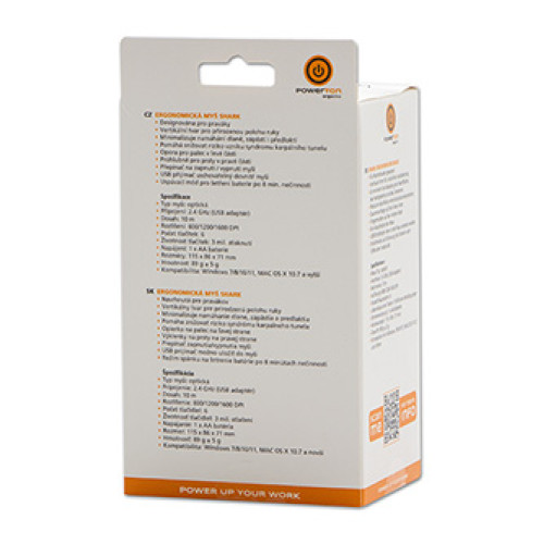 Myš Powerton ERGO SHARK je napájaná jednou AA batériou, ktorá poskytuje dlhú výdrž a minimalizuje potrebu častej výmeny. Pre úsporu energie sa myš v čase nečinnosti automaticky prepína do úsporného režimu, čím predlžuje životnosť batérie.